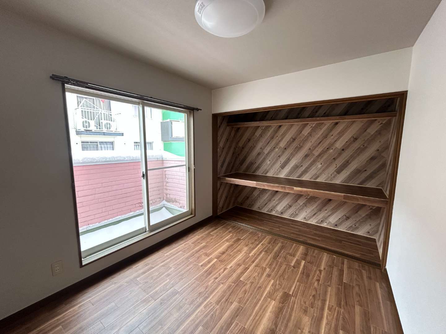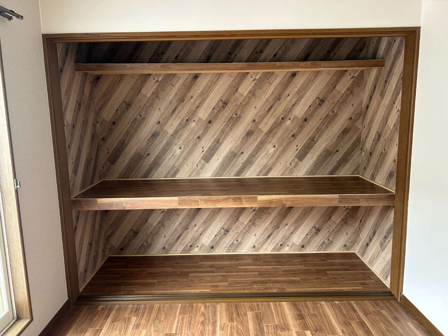 押入れは襖を取り払い、奥の壁面に斜めストライプの「木目調アクセントクロス」を大胆に施工しました。