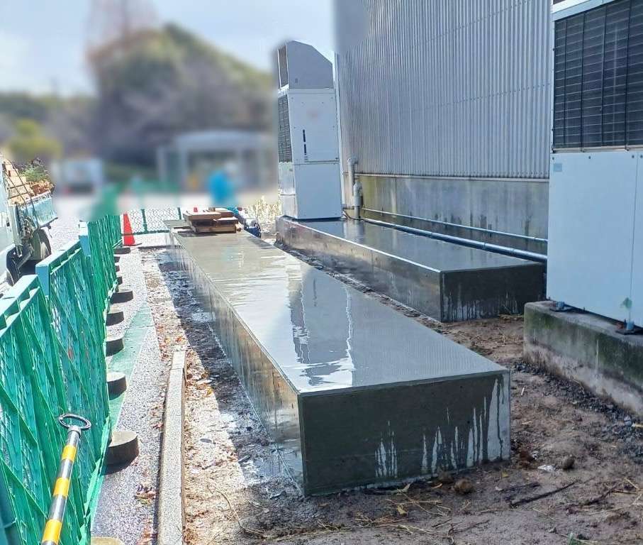 ①設備の故障リスクを低減(水平精度の確保) 基礎が傾いていると、回転機器(ポンプや室外機)の軸受に負荷がかかり、故障や異音の原因になります。プロの左官技術でフラットなレベル(水平)を出します。